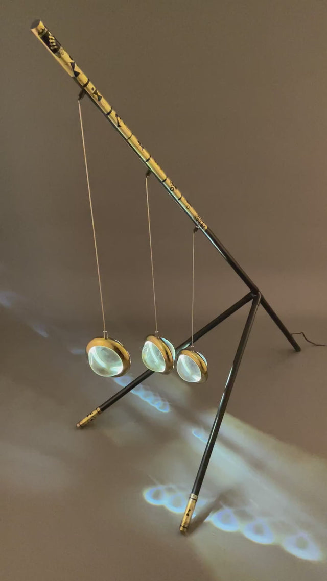the legs. 3 solid crystal balls are suspended with lighting inside.