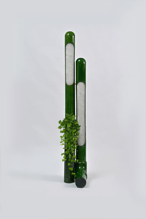 The Bamboo floor lamp combines metal and alabaster to create a striking design inspired by natural bamboo. Featuring an integrated planter, it brings a playful yet sophisticated vibe to your space by merging lighting and greenery in one elegant piece. Perfect for adding a touch of nature and modern style to your home.